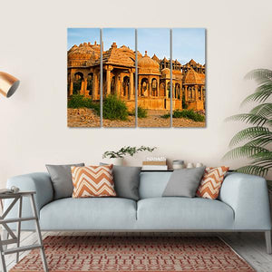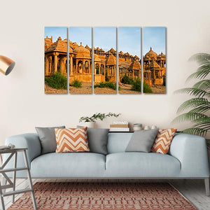 This canvas art captures the majestic cenotaphs of India, showcasing ancient sandstone architecture amid a serene desert landscape. The warm palette of orange and tan, complemented by cool blues and greens, evokes a historic, sunny mood perfect for infusing a sense of tranquility into your space.