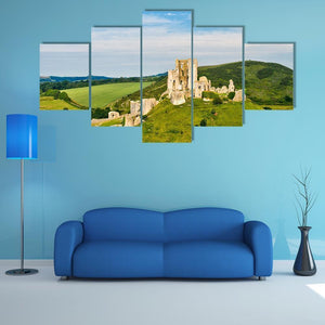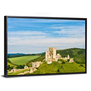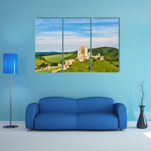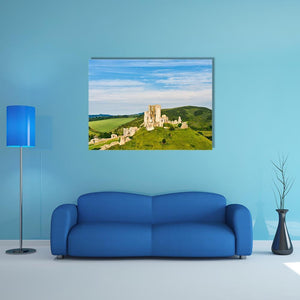 This canvas features the serene ruins of Corfe Castle set against rolling hills and a blue sky. The realistic landscape is rendered in calming greens and subtle tans, inviting a sense of peace to any space.