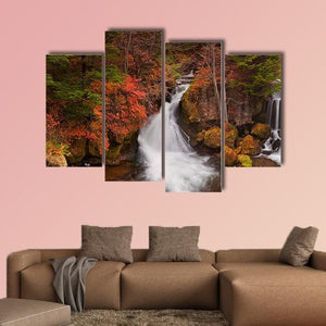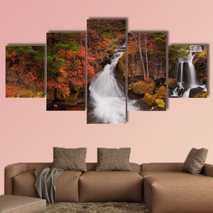 The Ryuzu Falls Japan Canvas Wall Art captures a serene autumn waterfall scene in Japan, with motion-blurred water set among orange and green foliage, rocks, and trees. Its rustic, vibrant mood works well in a nature‑inspired or rustic room.