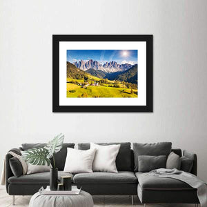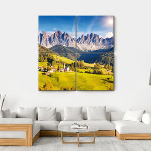 This canvas features a picturesque mountain village in Italy, complete with a serene white church steeple set against jagged peaks and lush green hills. The idyllic scene captures a bright, sunny day, inviting tranquility into any space.
