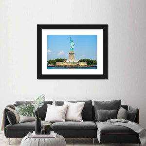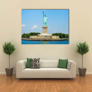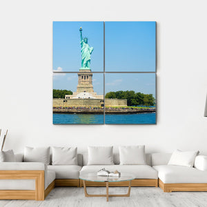 Capture the iconic Statue of Liberty as it stands majestically in New York Harbor. This photorealistic canvas features a vibrant palette of blue and green, set against a clear sky, evoking a bright and monumental atmosphere.