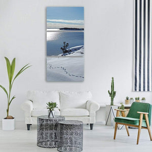 A serene winter landscape from Stockholm featuring a snowy hill, a small island, a lone tree and footprints leading through the snow. Sunlight glints on the water amid cool blue, white, gray and green tones, creating a calm, tranquil atmosphere. Suited to modern or Scandinavian-style rooms searching for a quiet nature scene.