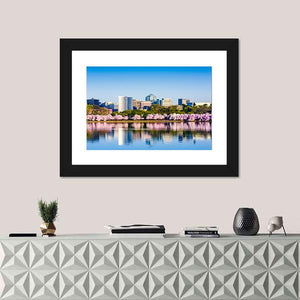 This landscape artwork showcases a serene city skyline adorned with cherry blossoms and reflected in calm waters. The bright palette of blues, pinks, and greens brings a refreshing atmosphere to any space.