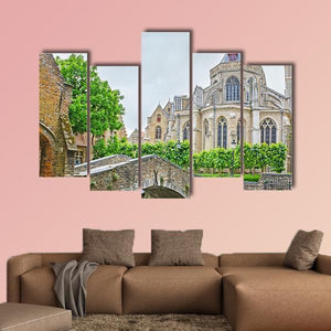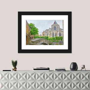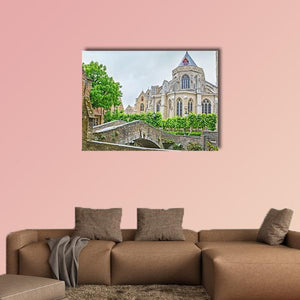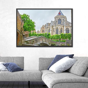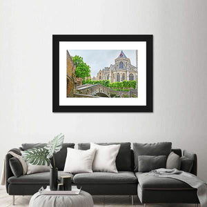 A realistic landscape showing a tiny stone bridge and a Gothic church beside a quiet canal, framed by trees. Soft greens, grays and beiges under a gentle overcast sky give the scene a serene, historic feeling that suits architecture- or nature-focused wall decor.
