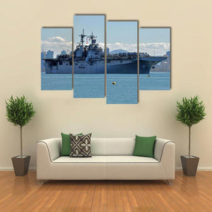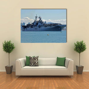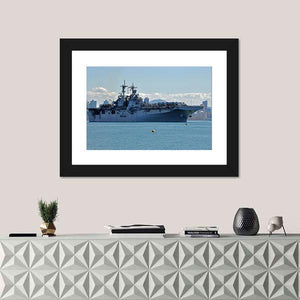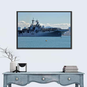 This canvas art captures the USS Boxer as it departs, set against a calm ocean landscape. The realistic style and soft blue and gray tones create a vast and serene atmosphere, making it a beautiful addition to any decor.