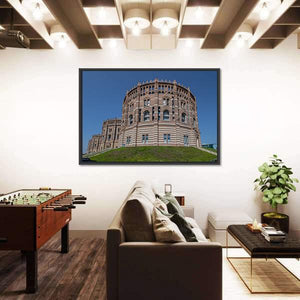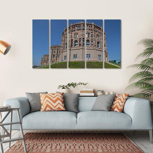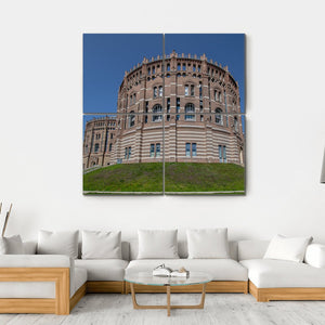 This cityscape captures the iconic historic gasometers of Vienna set against a clear blue sky. The grand composition features diagonal lines and a blend of earthy browns and greens, evoking a sense of history and architectural beauty.