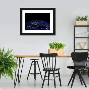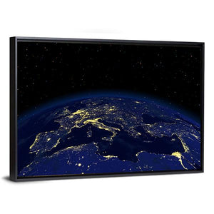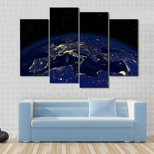 This stunning canvas print captures the earth at night, showcasing the illuminated continents of Europe, Africa, and the Middle East against a backdrop of stars. The palette of dark blue, yellow, and black creates a serene and awe-inspiring atmosphere.