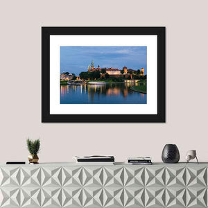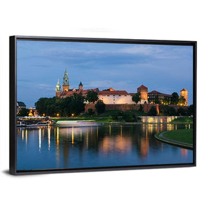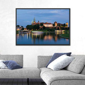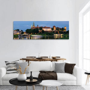 The Wawel Royal Castle Panoramic Canvas Wall Art depicts the castle, river, and boats in a peaceful, historic evening scene. Rendered in a realistic panoramic style with blue, brown, white, and green tones, it highlights lights reflecting on the water and works well in living rooms or studies.