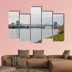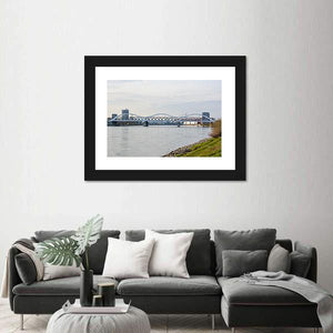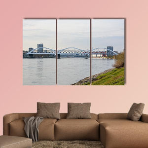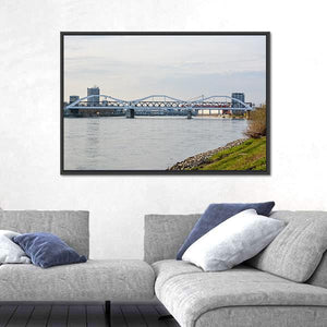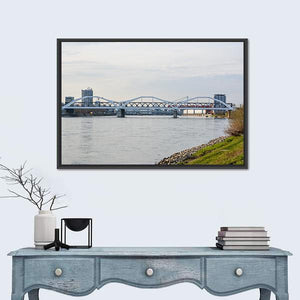 The White Bridge Germany Canvas presents a wide, eye-level view of a multi-span truss bridge crossing a river with grassy, rocky banks and a city skyline beyond. Soft blues, greys, white and touches of green give the scene a calm, serene urban mood. It works well in modern rooms and urban interiors that benefit from a peaceful landscape accent.