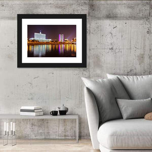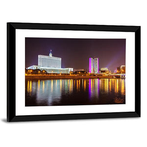 Capture the dynamic beauty of Moscow with this canvas art featuring a stunning government building illuminated at night. The vibrant palette of white, purple, yellow, and blue reflects the lively urban landscape, inviting warmth and modern sophistication to your space.
