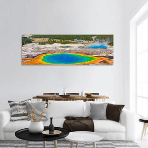A panoramic nature photograph of the Grand Prismatic Spring in Yellowstone National Park, showing the geothermal pool’s vivid blue, green, orange and yellow bands with steam rising above the water. Its vibrant, natural-wonder mood fits modern living rooms, offices, or nature-focused spaces that welcome colorful landscape photography.