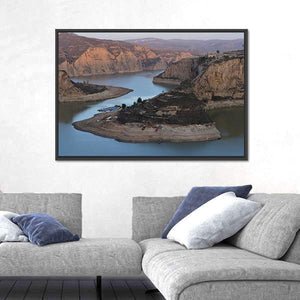 This panoramic canvas depicts a winding river running through steep canyon cliffs with a naturalistic palette of brown, blue, tan, and green in daylight. The wide-angle composition and strong depth of field create a serene, vast atmosphere that works well in modern or nature-inspired room decor.