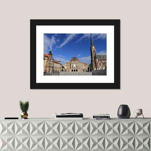 A sunny, grand daytime cityscape of Theatre Square, Germany showing ornate building facades, a paved plaza and a tall spired church under a blue sky with clouds. The realistic architectural composition and blue-brown palette suit modern living rooms, entryways, or offices.