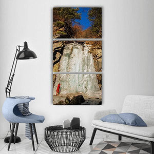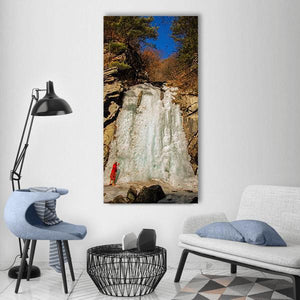 A realistic nature photograph of a frozen waterfall with a lone person in red, conveying a serene, majestic, and cold mood. Ice formations, a rocky cliff and pine trees under a clear blue sky create a quiet, contemplative focal point suited to a meditation room, modern living space, or nature-inspired décor.