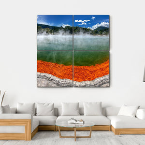 This canvas features the ethereal beauty of Champagne Pool in New Zealand, showcasing vibrant orange mineral deposits and wisps of steam rising from the clear water. Its natural and serene vibe makes it a beautiful addition to any space in need of a calming touch.