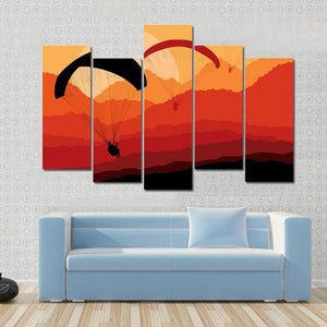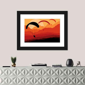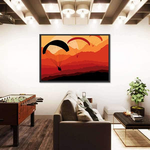 This canvas art captures three paragliders gliding gracefully over layered mountains at sunset. The vibrant palette of orange, red, and yellow evokes a sense of adventure and serenity, making it a striking addition to any modern space.