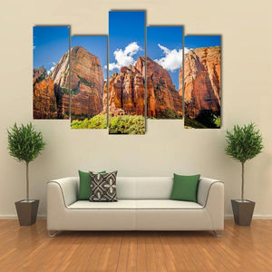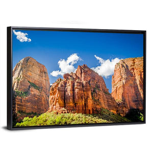 This landscape artwork captures the majestic Three Patriarchs rock formations of Zion National Park. With a serene palette of orange, brown, green, blue, and white, it evokes a sense of grandeur and tranquility, making it a striking choice for nature lovers.