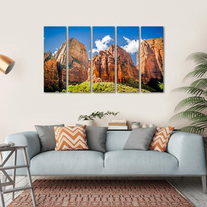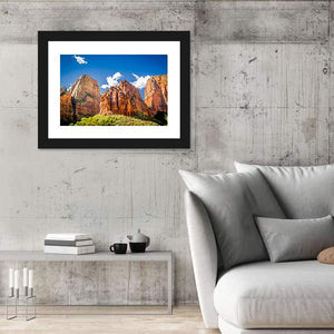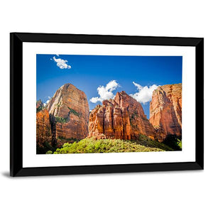 This canvas art captures the majestic rock formations of Zion National Park, showcasing the grandeur of mountains beneath a serene sky. The layered rock strata and fluffy clouds evoke a natural, peaceful atmosphere that's perfect for enhancing your space.