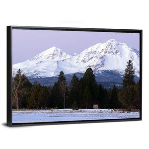 Snow-capped mountains, pine trees, and a small cabin stretch across this panoramic canvas in a cool palette of white, green, brown, purple, and blue. The scene feels serene and majestic with a calm winter daytime atmosphere. It pairs well with modern or nature-inspired rooms as understated wall decor.