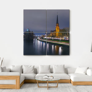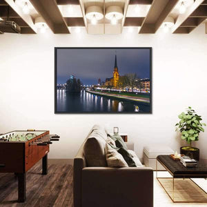 Capture the serene beauty of a church illuminated against a vibrant city skyline. This modern canvas art features deep blues and warm yellows, reflecting off the nearby river for a peaceful evening ambiance.