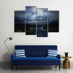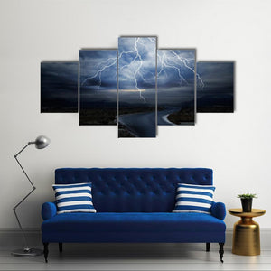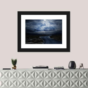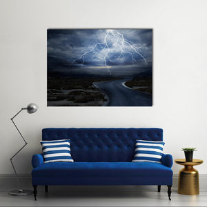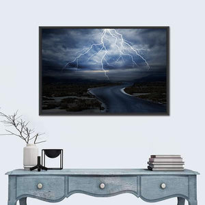 This striking canvas print captures a dramatic scene of jagged lightning illuminating a stormy sky over a wet road, evoking an intense and mysterious atmosphere. It's a perfect piece for modern spaces seeking a touch of nature's power.