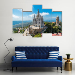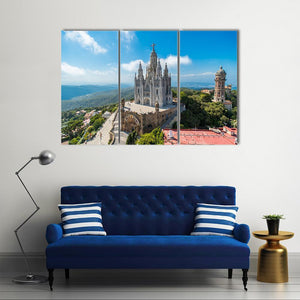 This canvas art features a serene landscape of the Gothic-style Tibidabo Church nestled among picturesque mountains and trees. The eye-level perspective captures a beautiful interplay of blue skies and white clouds, creating a grand atmosphere.