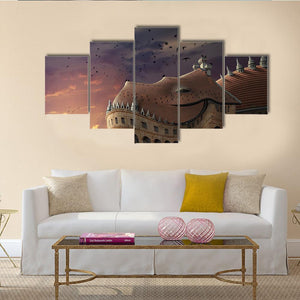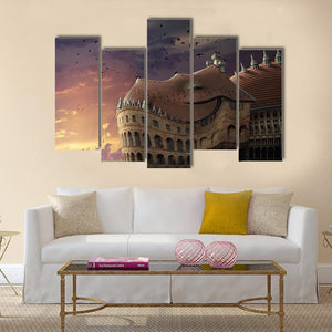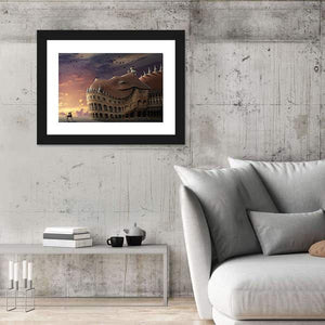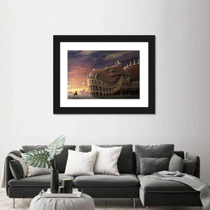A surreal scene of a twisted building, a lone horse rider and a flock of birds set beneath a stormy, sunset sky. The orange, purple and brown palette gives the piece a mysterious, dramatic, and dreamlike atmosphere—suited to modern or fantasy-inspired rooms.