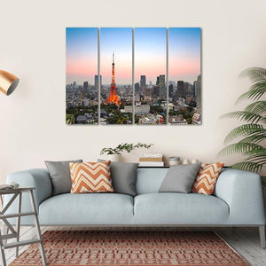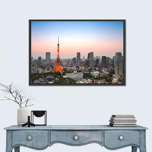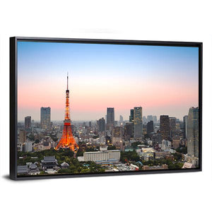 Capture the vibrant energy of Tokyo with this stunning canvas art featuring the iconic Tokyo Tower. The photorealistic depiction showcases a beautiful skyline illuminated at dusk, blending orange, blue, and gray tones that evoke a lively urban atmosphere.