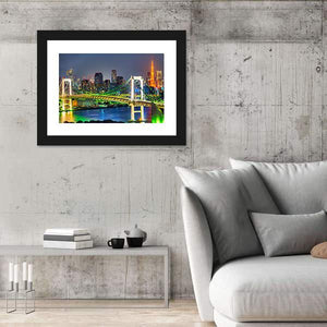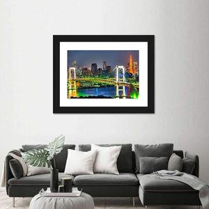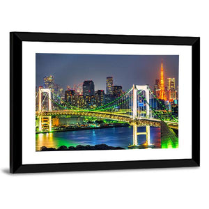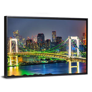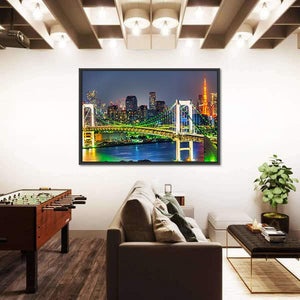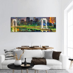 Rainbow Bridge In Tokyo shows the illuminated suspension bridge and Tokyo city skyline at night, with glowing lights and tall buildings. Rendered in green, yellow and blue tones, the panoramic cityscape feels vibrant, urban and dynamic — a modern canvas print that suits contemporary living rooms or office spaces.