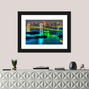 Capture the vibrant skyline of Tokyo with this stunning canvas print that highlights the illuminated Rainbow Bridge and towering buildings. Perfect for adding an energetic urban atmosphere to your space.
