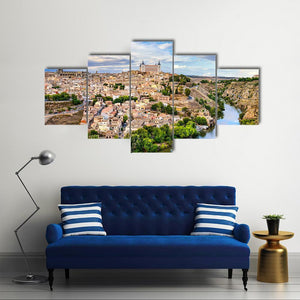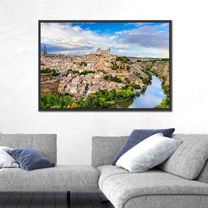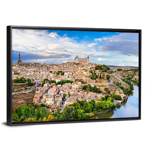 Capture the charm of Toledo's skyline with this serene canvas wall art. Featuring a picturesque view of historic buildings with red tile roofs, a majestic white castle, and a winding river, this artwork brings a sense of tranquility to any space.