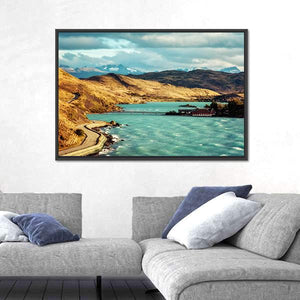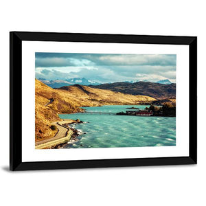 A realistic landscape view of Torres del Paine in Chile, showing snow-capped mountains, a lake, a curving road and a pier with a building on the water. The scene feels serene and grand, rendered in blue, tan, white and green tones that suit modern or nature-inspired rooms.