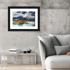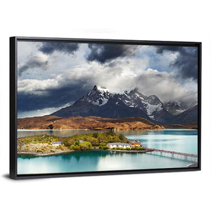 Lake Pehoe Panoramic Canvas Wall Art features snow-capped mountains, a rocky island with trees, a footbridge, and a wide lake in a panoramic composition. Rendered photorealistically with dramatic lighting and stormy clouds, the scene feels both dramatic and serene. It suits modern living spaces and room decor.