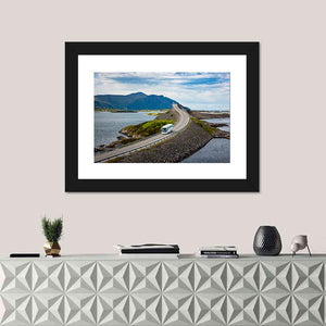 A panoramic scene of a white tourist bus crossing a curving coastal road and bridge, with ocean and distant mountains. The image feels scenic and tranquil with a hint of adventure, rendered in a realistic style using blue, green, gray, and white tones. Suits modern or travel-themed rooms.