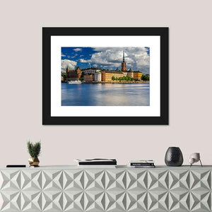 A realistic cityscape canvas showing a tourist ferry crossing Lake Malaren with a wide-angle waterfront skyline, detailed buildings, a spire and fluffy clouds. The blue, brown, white and green palette creates a serene yet vibrant, historic mood—suitable as subtle wall decor for living rooms or offices.