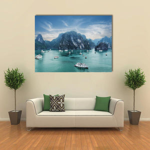Experience the serene beauty of Ha Long Bay with this captivating canvas print. Featuring floating junks amidst limestone karsts and islands, it evokes a peaceful atmosphere that complements any room.