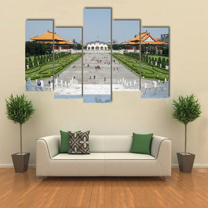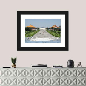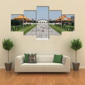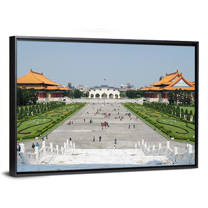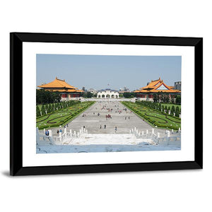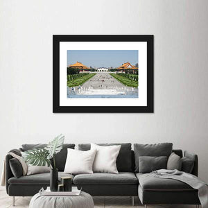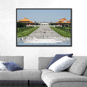 This landscape canvas art captures the grandeur of a monumental plaza, featuring an impressive grand archway and ornate buildings set against manicured gardens. With a vibrant palette of blue, green, and orange, it brings a sense of life and elegance to any space.