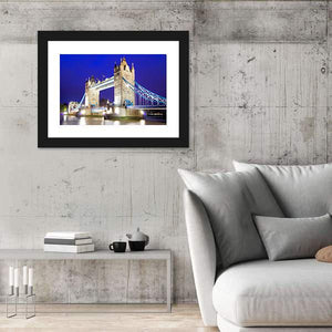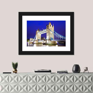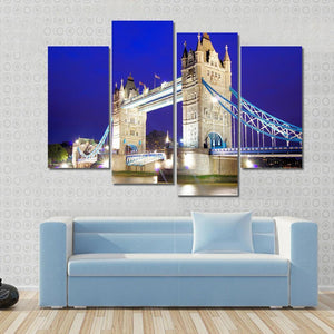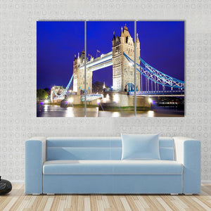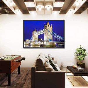This stunning canvas art captures the iconic Tower Bridge as it gracefully spans the River Thames at night. The detailed, realistic depiction showcases the bridge illuminated against a backdrop of blue and grey hues, making it a grand addition to any wall decor.