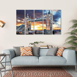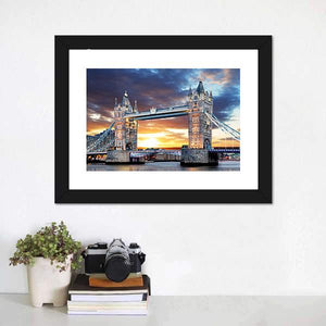This striking canvas captures the majestic Tower Bridge in London, set against a dramatic sunset. The glowing windows and turbulent clouds create a serene atmosphere, making it an impactful piece for any art lover.