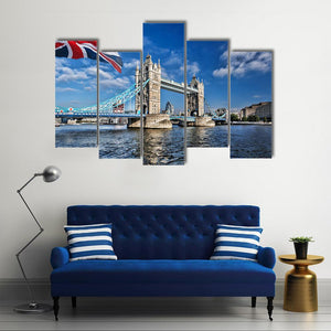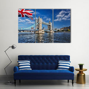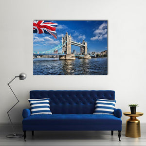 Celebrate the iconic Tower Bridge with this stunning canvas wall art. The realistic depiction captures the proud spirit of London, featuring the Union Jack waving amidst rippling water and a scenic sky.