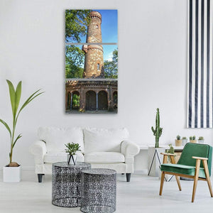 This photorealistic canvas depicts a historic brick tower in Darmstadt, Hesse, Germany, set among trees beneath a calm summer sky. The centered, eye-level composition highlights the tower’s arched walkway and visible spiral staircase, creating a serene, natural mood that pairs well with modern or nature-inspired décor.