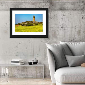 Tower of Hercules in A Coruna sits on a grassy hill above a field of yellow flowers, rendered in a photorealistic landscape with bright, sunny light. The rule-of-thirds composition leaves room around the tall stone lighthouse against a blue sky and green grass, creating a cheerful, summery atmosphere. Works well in living rooms, entryways, or modern home décor as a friendly focal piece.