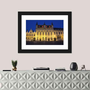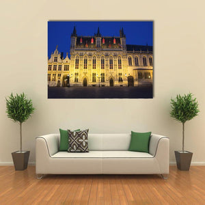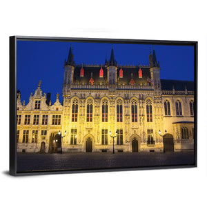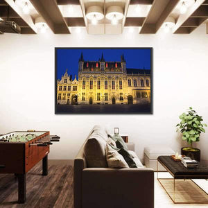 This canvas wall art captures the enchanting architecture of Bruges at night, featuring ornate building facades and glowing windows. The evening scene, set against a palette of yellow and blue, adds warmth and sophistication to any room.
