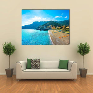 This stunning canvas art captures a vibrant coastal town on the Amalfi Coast, showcasing a pebble beach and cheerful orange umbrellas. With its bright blue ocean and lush green mountains, it brings a sunny, idyllic atmosphere to any space.
