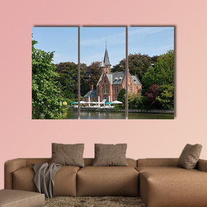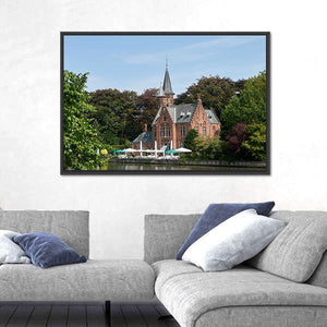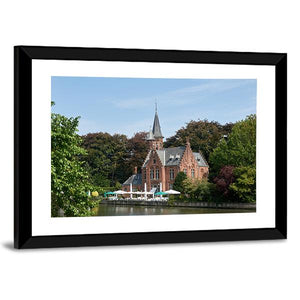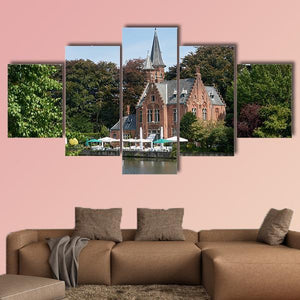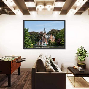 A photo-realistic landscape of Bruges, Belgium depicting a castle, calm lake, trees and a waterside restaurant. Red umbrellas and a tall spire set against a green, blue and white summer palette create a peaceful daytime mood that fits modern room decor.