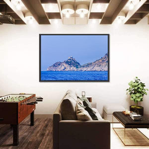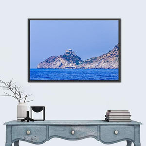 A photorealistic landscape of Conca Dei Marini on the Amalfi Coast, showing a stone building perched on coastal cliffs beside the blue sea. The rule-of-thirds composition and a palette of blues, whites, grays, and browns give the scene a serene, expansive mood. Suited to coastal, modern, or nature-inspired room decor.