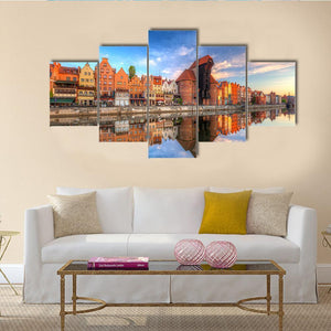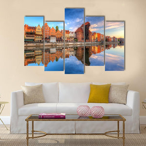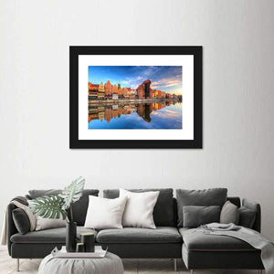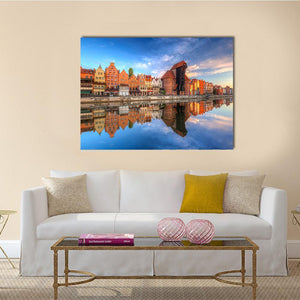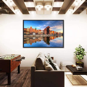 Town of Gdansk reflected in the Motlawa River captures gabled historic buildings mirrored in calm water. This photorealistic landscape blends blues, oranges and a dramatic sky for a vibrant, picturesque and serene scene that suits modern room decor.