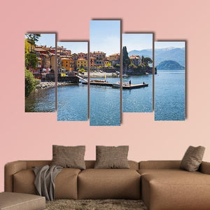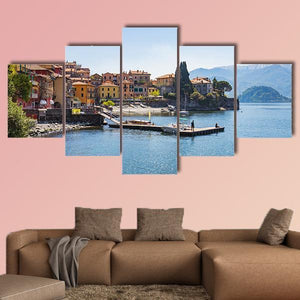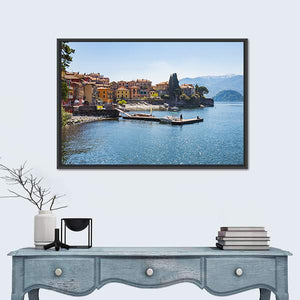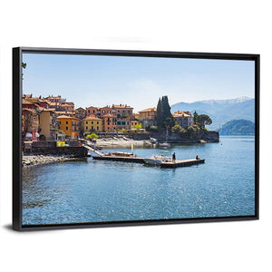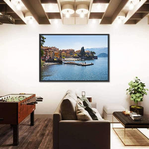 Photorealistic view of the town of Varenna on Lake Como, Milan, Italy, showing colorful buildings along the shore, boats docked, and a clear summer sky. The scene feels peaceful, serene, and bright — a scenic choice for modern or Mediterranean-style rooms seeking a calm focal point.