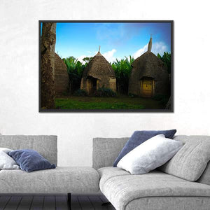 Traditional Dorze tribe village in Ethiopia, captured with conical thatched roofs, wooden doors and lush tropical foliage. The wide-angle triptych composition and green-brown-blue palette give a serene, rustic, natural mood. It suits nature-inspired or rustic rooms looking for calm, earthy wall decor.