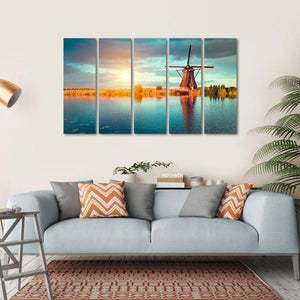 This serene landscape captures the beauty of traditional Dutch windmills during a tranquil sunset. With reflections shimmering on the water and lily pads gently floating by, it's a perfect piece to enhance any room with its calming blue and orange hues.